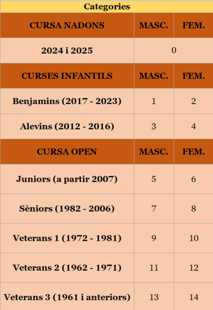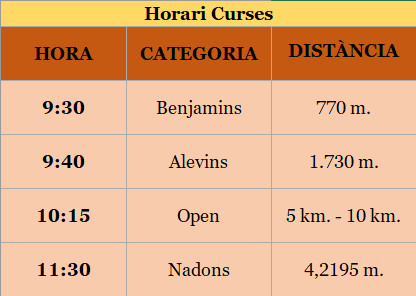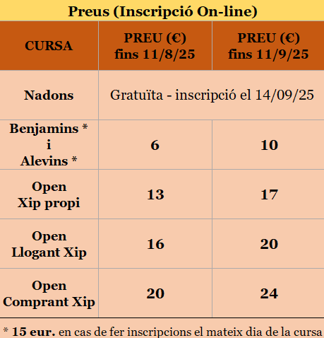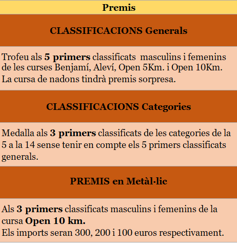 Consideracions 1 – Prova oberta a tothom, federat o no federat, de qualsevol nacionalitat i sexe, que accepti el present reglament. 2 – S’organitzen quatre curses, una Benjamí, de 770 metres, una Aleví, de 1.730, una Open, que pot ser de 5.000 metres o de 10.000, i una “cursa” de Nadons, que hauran de cobrir uns 4 metres gatejant. 3 – Per a la cursa Open s’utilitzarà el sistema de cronometratge del xip groc (CHAMPIONCHIP). Es pot fer servir el xip de propietat o un de lloguer. També hi ha l’opció d’aprofitar la cursa per comprar-ne un. No es pot còrrer sese xip groc. 4 – En la inscripció a la cursa Open no cal especificar la distància, ja que cada corredor decidirà en acabar la primera volta si va cap a meta per completar la cursa de 5 km o si comença la segona volta per fer la de 10 km. Passats 37 minuts des del moment de la sortida, ja no es permetrà optar a la cursa de 10 km i serà obligatori finalitzar la de 5 km. 5 – Inscripcions: Veure apartat d’Inscripcions. 6 – Categories: De la 1 a la 14 segons la taula adjunta. L’organització pot demanar el DNI o similar per comprovar l’edat. Les categories de la cursa Open afecten només la classificació dels 10 km. No s’estableixen categories d’edat per a la cursa de 5 km. Només hi haurà una classificació general per sexe. No hi ha edat mínima per participar en la cursa Open. Sota responsabilitat dels pares, els nens podran córrer la cursa encara que tinguin l’edat per córrer la Benjamí o Aleví. 7 – Hi haurà dos avituallaments d’aigua i esponges durant la cursa, i un tercer al final. 8 – Servei de dutxes per a tothom en acabar la cursa. Hi haurà servei de guarda-roba. 9 – Obsequis: Hi haurà samarreta de record, sorteig de material divers i coca i beguda per a tots els participants. 10 – Els participants es veuen obligats a respectar en tots els conceptes les marques patrocinadores de la Cursa. El dorsal s’ha de portar perfectament visible. 11 – L’organització declina tota responsabilitat pel què fa als accidents, lesions o altres perjudicis que la participació en el Cros pugui comportar als inscrits. 12 – La cursa està cardioprotegida, amb desfibril·lador mòbil per accedir ràpidament amb a qualsevol punt del circuit. 13 – Pel sol fet de participar s’accepta el present reglament. Tot el que no estigui especificat queda sota la decisió de l’organització. |